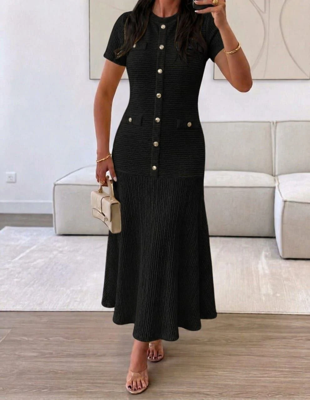 فستان أسود أنيق بتصميم ميدي عصري، معمول بخامة مريحة وخفيفة مناسبة للصيف.